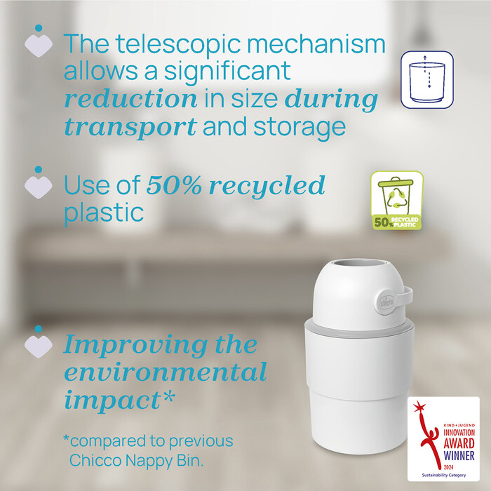 "Telescopic Diaper Pail A cleverly designed diaper pail that neutralizes odors, fits into any space, and makes daily life with your baby cleaner, easier, and more comfortable. Features: •Hygiene & odor control for a fresh environment •Easy one-handed use, ideal for daily life with your baby •Telescopic design that adapts to the space •Fewer trips, more comfort at home Works with Chicco Odour OFF bags or standard trash bags. The telescopic mechanism (which folds and unfolds) allows for a significant reduction in size for easy transport and storage. Made from 50% recycled plastic"