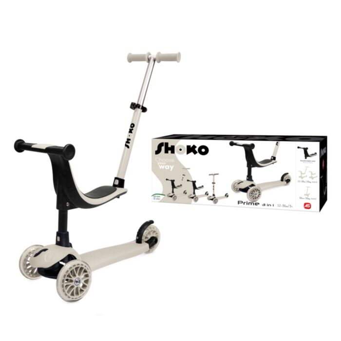 SHOKO Prime 4 in 1 PLUS is a multi-function scooter for children from 12 months to 6 years. It offers three separate functions that initially make it safe for the child's first rides with parental guidance, then suitable for learning balance and finally transform it to a training scooter for the child's first contact with real scooter driving. Switching from one function to another is easy and does not require the use of any tools.