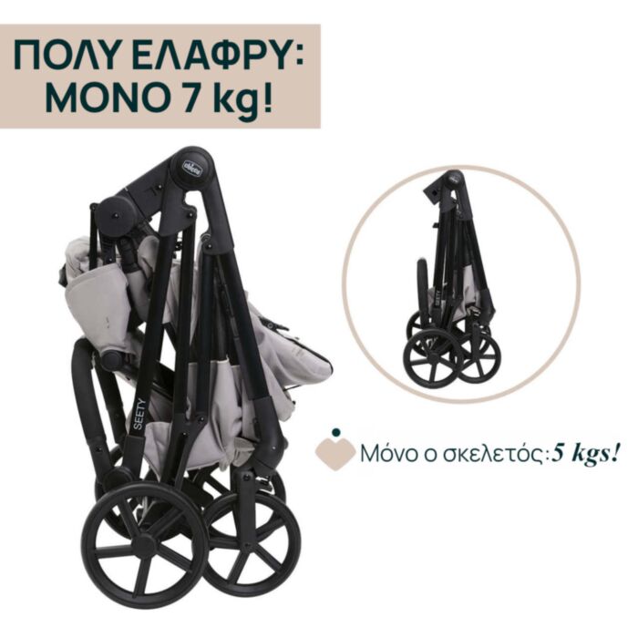 - Το καρότσι Seety είναι η κατάλληλη λύση για την πόλη: είναι μόνο 7 κιλά και μπορεί εύκολα να διπλωθεί με το ένα χέρι ενώ κρατάτε το μωρό!