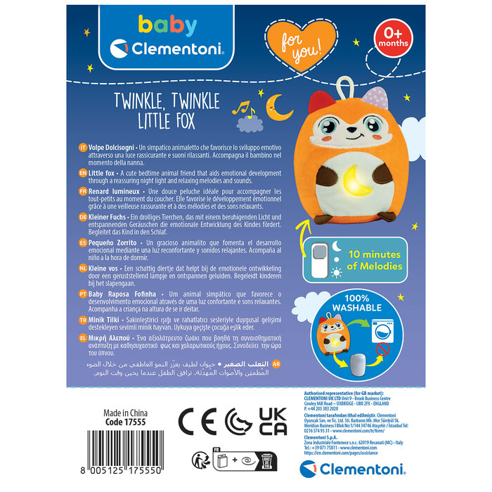 Η Twinkle-Twinkle Αλεπού είναι ένα απαλό λούτρινο παιχνίδι που λειτουργεί ταυτόχρονα ως νυχτερινό φωτάκι, σχεδιασμένο για να χαρίζει στο μωρό ηρεμία και αίσθηση ασφάλειας. Με ένα απαλό πάτημα στην κοιλίτσα, ενεργοποιείται ένα ζεστό φως μαζί με χαλαρωτικές μελωδίες και λευκούς ήχους, δημιουργώντας το ιδανικό περιβάλλον για χαλάρωση και ύπνο.