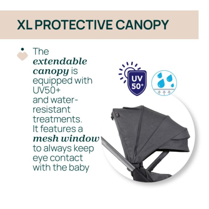 XL επεκτεινόμενη κουκούλα με προστασία UV50+ και παράθυρο με δίχτυ για να να διατηρείται η οπτική επαφή με το μωρό.